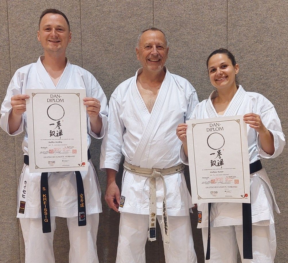 Am Samstag, 12. April 2025 stellten sich Melissa Kaiser und Steffen Kreissig der Prüfung zum nächst höheren DAN-Grad. Die Prüfung fand in Breisach mit den Prüfern Helmut Spitznagel und Josef Faller statt. Beide Prüflinge bestanden ihre Prüfung. Melissa ist nun Trägerin des 2. DAN und Steffen Träger des 3. DAN. Die Budoschule gratuliert beiden recht herzlich und wünscht ihnen weiterhin viel Erfolg. Melissa und Steffen freuen sich gemeinsam mit ihrem Trainer Peter über die bestandene DAN-Prüfung